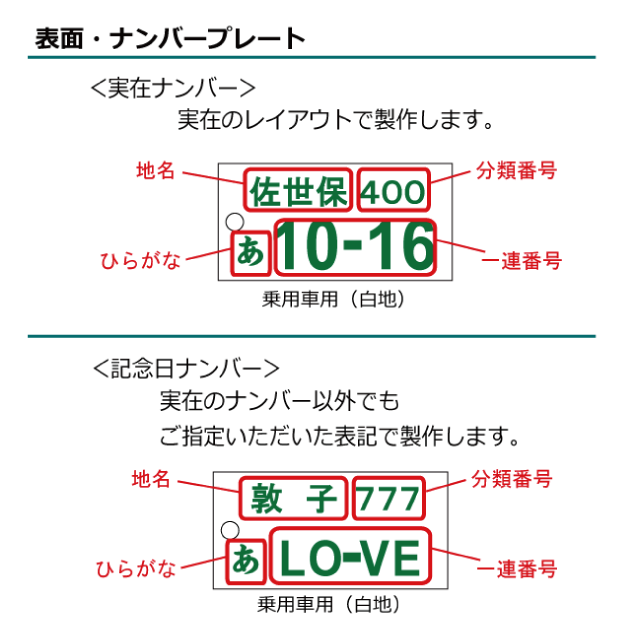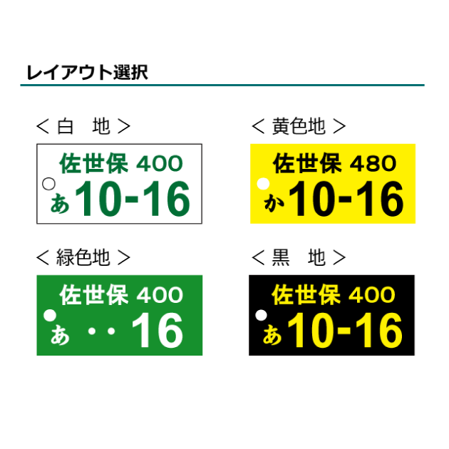乗用車用(白地) 軽乗用車用(黄色地) 貨物車用(緑地) 軽貨物車用(黒地) |