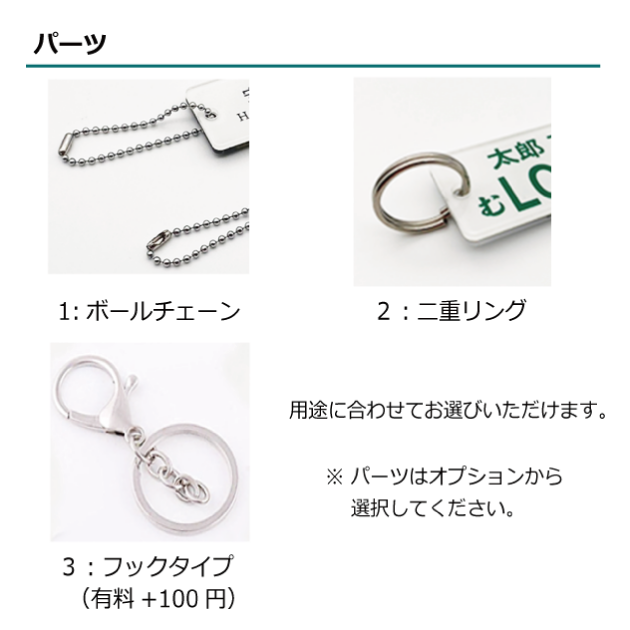| 材質・素材 | アクリル4㎜(2㎜貼り合わせ) 本体:アクリル製 パーツ:ボールチェーン(無料)/二重リング(無料)/フックタイプ(有料+100円) |