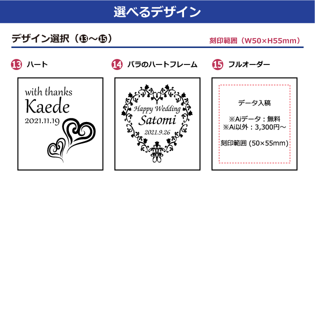 セミオーダー(デザインから選択)をご注文のお客様は、刻印する内容を以下の〈文字①〜③〉にご記入ください。1個目と2個目、それぞれの内容をご指定いただけます。