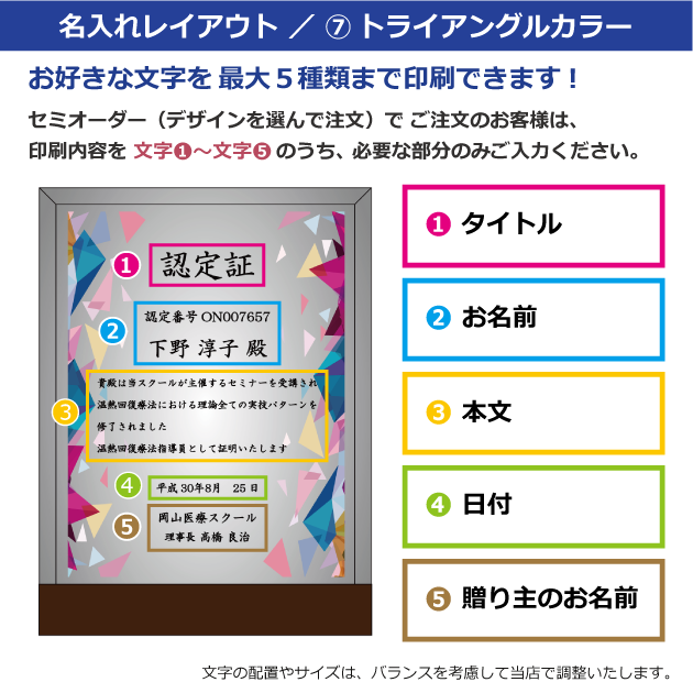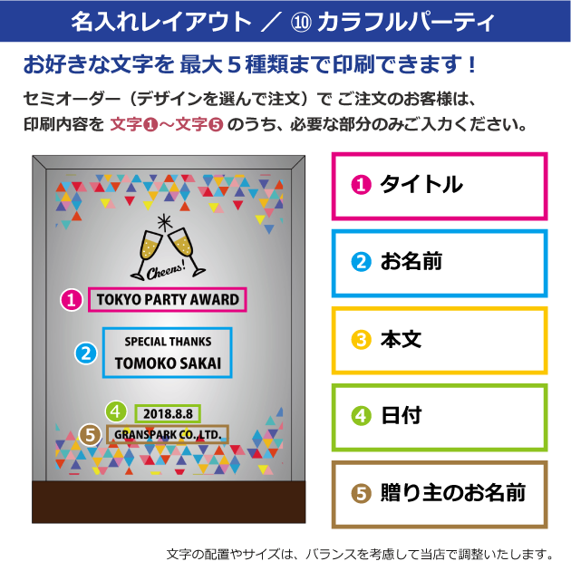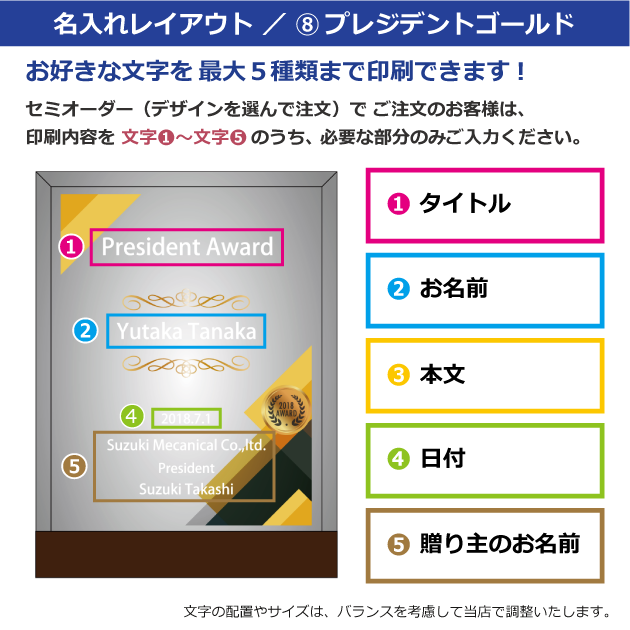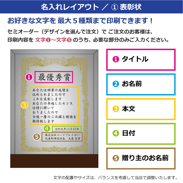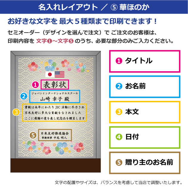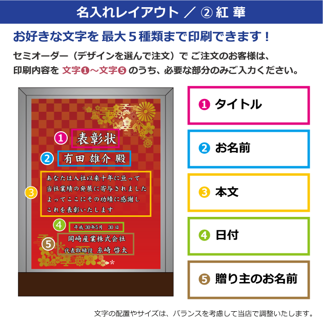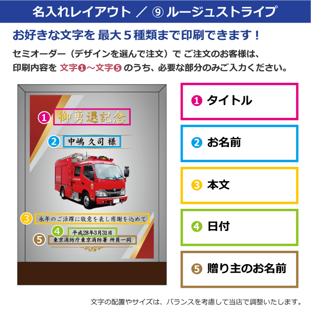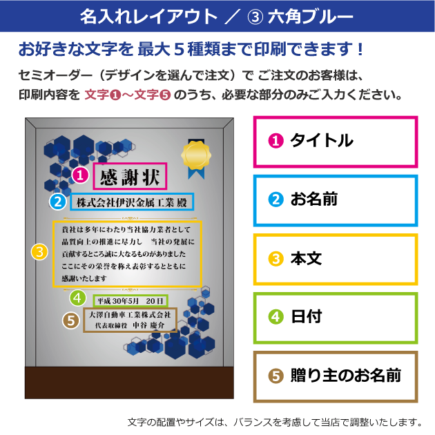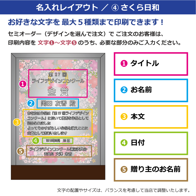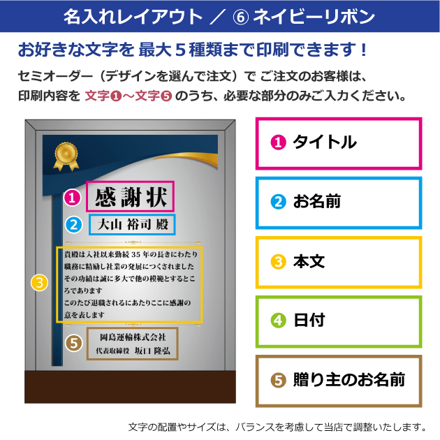 セミオーダー(デザインから選択)をご注文のお客様は、以下の〈文字①〜⑤〉にご記入ください。