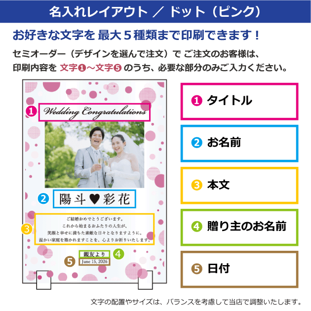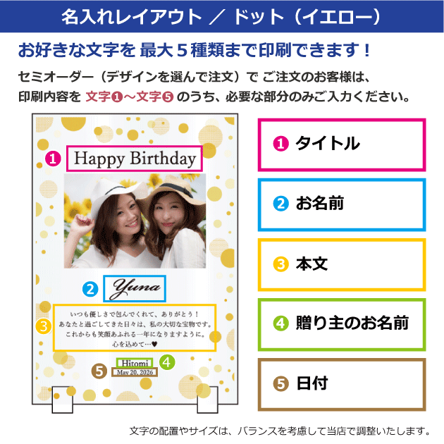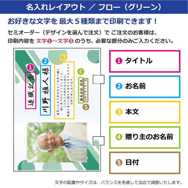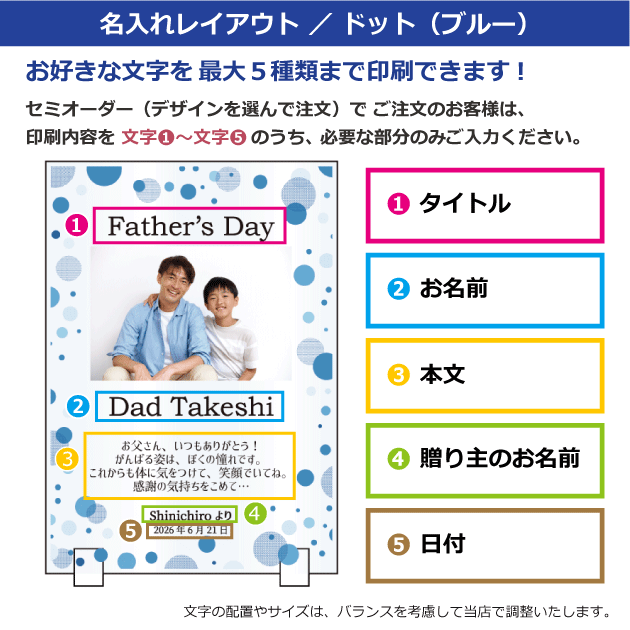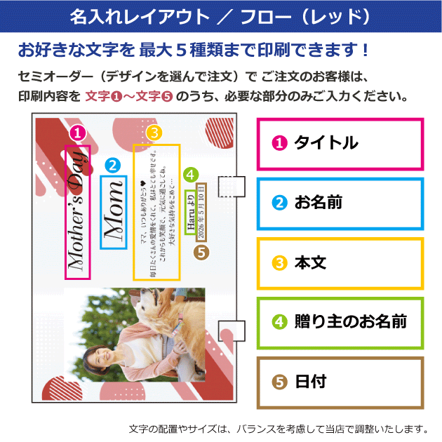 セミオーダー(デザインから選択)をご注文のお客様は、以下の〈文字①〜⑤〉にご記入ください。